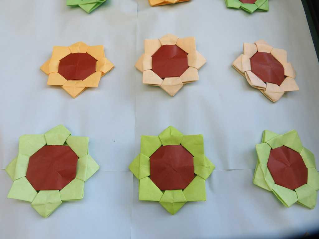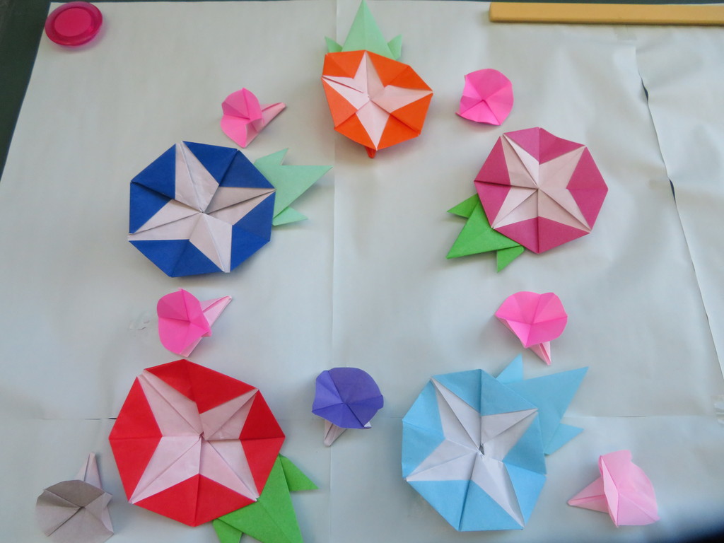 8月の折り紙カレンダーは、ひまわり・あさがおです。